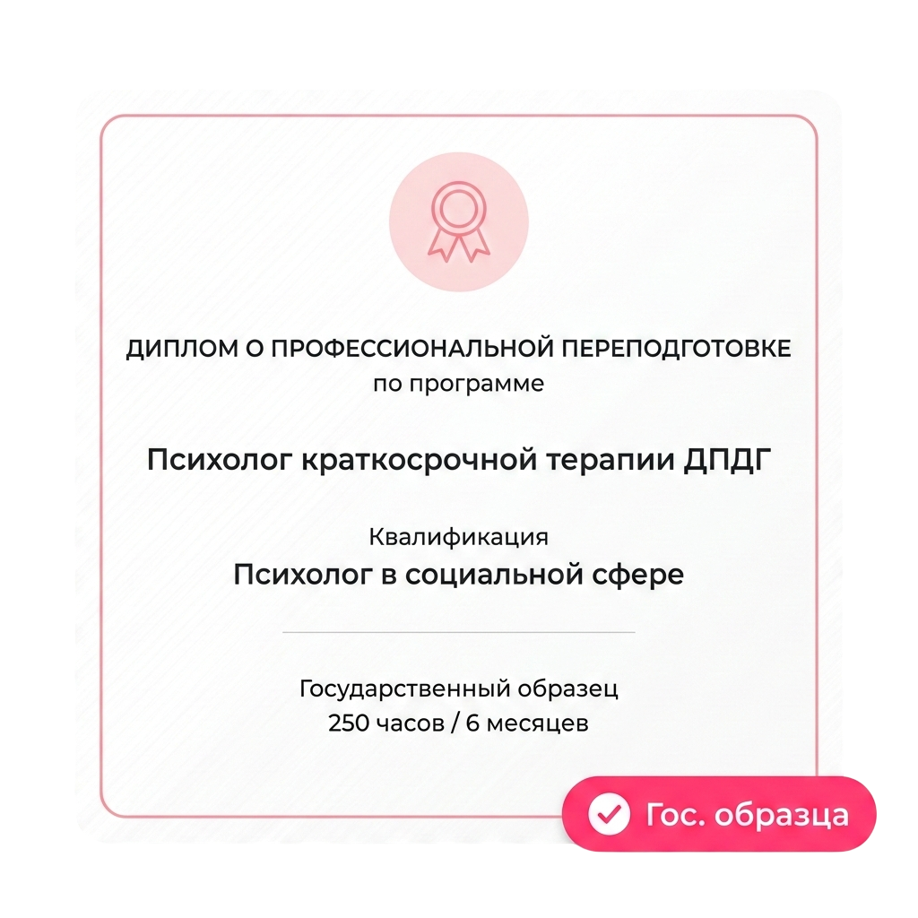 По окончании обучения вы получаете диплом установленного образца по специальности «Психолог краткосрочной терапии ДПДГ», который даёт право вести деятельность на территории РФ.
